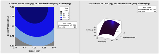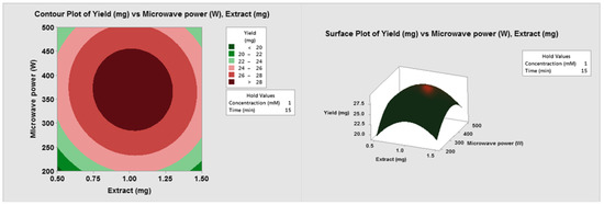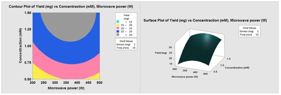 Three-dimensional response surfaces and two-dimensional contour plots were presented to describe the optimization: the diagrams illustrate the effects of two factors on NP yield at a time. Figure 1 shows the effect of the fungal biomass (extract) and the concentration of total metals on NP yield after 15 min with 350 W microwave power. Increasing the metal concentration from 0.5 mM to 1.5 mM doubled the NP yield. Increasing the fungal extract from 1 mg to 1.5 mg reduced the yield. When the concentration was 1 mM, the maximal yield was achieved between 300 and 500 W and between 0.8 and 1.25 mg extract (Figure 2).