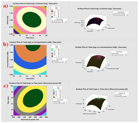 The effect of (a) time and fungal biomass (extract) (b) time and total metal concentration, and (c) time and microwave power on the yield of Ag-Cu NPs.