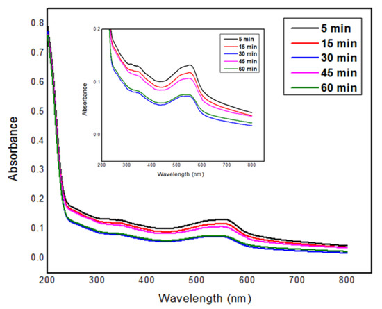 The UV-Vis spectra showed the maximum absorbance after 60 min (Figure 5). The formation of NPs started at 5 min and ended at 60 min.