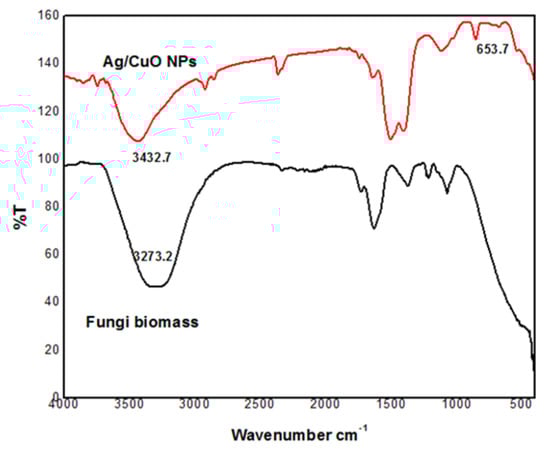 The formation of Ag/CuO NPs was monitored using a UV-Vis spectrophotometer (UH3500, Hitachi, Tokyo, Japan). Reducing and capping agents present in the fungal biomass were analyzed using a Fourier transform infrared spectrophotometer (FT-IR, Thermo Fisher Scientific, Waltham, MA, USA). The powder X-ray diffraction technique was used to analyze the structure and nature of the synthesized Ag/CuO NPs using CuKα radiation. The average size of the NPs was calculated using the Scherrer equation:
