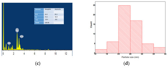 SEM images showed the agglomerated and spherical shapes of the bi-metallic NPs (Figure 8a). From the TEM image, spherical NPs and the dispersion of agglomerated particles were observed (Figure 8b). The elemental analysis showed the presence of Ag, Cu, and O without any impurities (Figure 8c). The Scherrer equation gave the average NP size of 22 nm. The particle size histogram shows that the particle size 20–22 mm was the most common, having 11 counts (Figure 8d). Small (12–18 nm) and large (>30 nm) were in the minority with fewer than 10 counts combined.