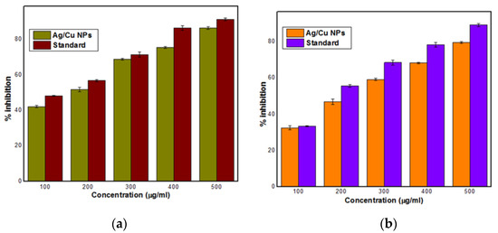 DPPH (a) and hydrogen peroxide (b) scavenging activity of Ag-Cu NPs (mean and SD, n = 3).