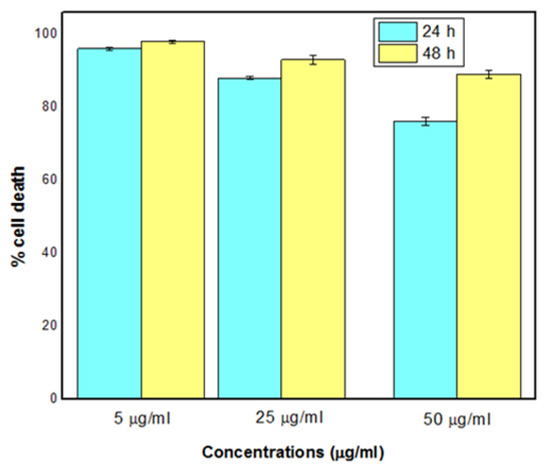 Bi-metallic NPs caused the highest cell death at a 5 µg/mL NP concentration, where 95% of the cells died in 48 h (Figure 10). At the highest NP concentration (50 µg/mL), cell death was lower, at 90%.