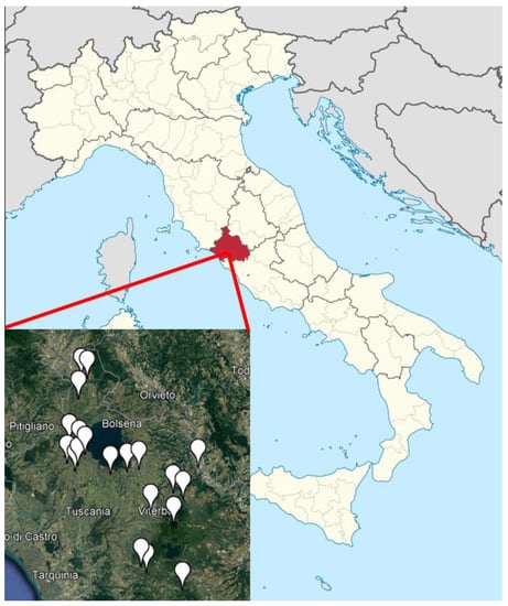 Field trials were carried out from March 2014 to September 2014 (220 days) in 22 apiaries distributed in the Viterbo province (Central Italy), in an area of approximately 2700 km2 (Figure 1).