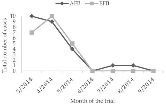During the whole observation period, untreated colonies showed a peak of AFB cases in March (10 outbreaks) and April (9 outbreaks) while EFB showed the largest number of cases in the untreated group in April (Figure 2).