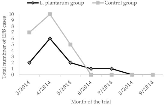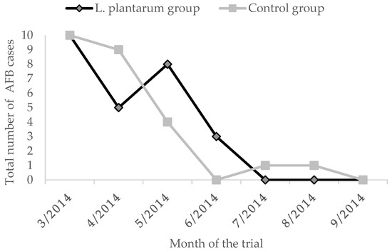 The overall prevalence of clinical cases in the untreated group was of 5.1% for AFB and 4.5% for EFB. The administration of L. plantarum for four weeks determined a reduced EFB prevalence of 2.0%. On the contrary, the prevalence of AFB in the treated group was higher than the untreated group of 0.2% (Figure 3 and Figure 4, Table 2). Moreover, during the whole observation period, the group treated with L. plantarum showed lower cases of EFB, except during June and July (Figure 3), after 4 months since the end of the treatment.