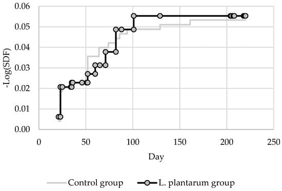 Kaplan–Meier estimator of the survival function, followed by Log-Rank test was used to evaluate the efficacy of L. plantarum administration in preventing disease outbreaks in tested colonies. Data were processed by means of statistical software XLSTAT™ (Addinsoft, Paris, France, 2020).