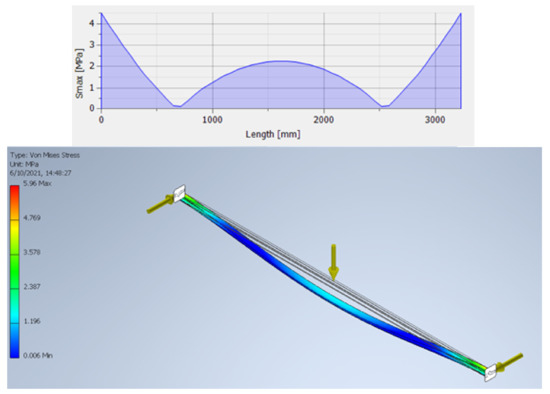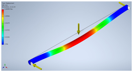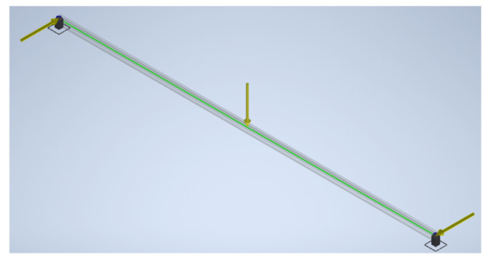 Once the simulation of the earthquake has thrown the loads that the beams must resist, a stress analysis simulation with the Autodesk Inventor software is performed with the design of the CAD shown in Figure 2. The frame analysis was utilized, since it uses a DSC algorithm that generates a node in the structure allowing us to define elastic releases in the beam [36]. In this sense, the joints can be simulated as fixed nodes in the extremes of the profile, the loads can be applied in this joint of the beam with the magnitude and direction found in the CYPE simulation for the worst case and it includes the gravity as displayed in Figure 3, allowing us to know the strength that the alternative material must endure.