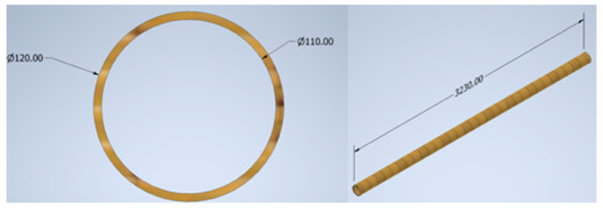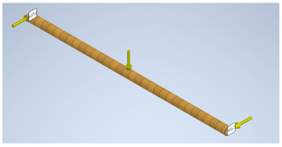 In order to validate the best material selected according to the MCDM, a simulation of a beam is performed by finite element analysis. In this sense, the best material considered is the bamboo; however, according to the literature, the diameter of the bamboo specie Guadua in Latin America presents a diameter between 120 mm to 160 mm [40] and the width along the tangential direction can be from 5 mm to 20 mm [41]. In this sense, the model will consider the lowest diameter and the minimum width, as it can be seen in Figure 4. Additionally, the same loads applied before for the steel beam are applied here, as it can be seen in Figure 5.