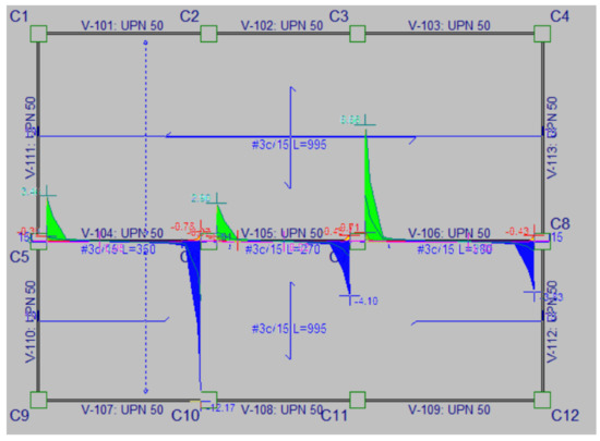 After the modelling of the structure, it is shown in Figure 6. Furthermore, the simulation of the loads resulting from the wraps shows that the joints are the zone that have the highest loads; in this sense, it has been identified that the column-beam joints are the most common cause of failure in moment-resist frames due to the shear failure [9], as it can be seen in Figure 7 for the highest load, and Table 2 displays all the values, where the negative load of C6 represents the highest load with 12.17 KN. Furthermore, the result of the simulation performed in the steel profile is presented in Figure 8 where the maximum normal stress is 5.96 MPa located in the joint of the beam and the column.