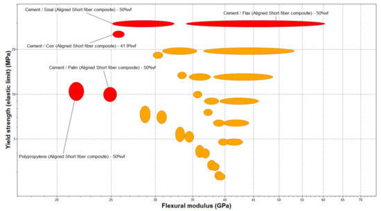 After the development of different simulations of reinforced concrete with fibers, six results for each composite are obtained, and to select the best a comparative chart of yield strength vs. flexural modulus is created. In this way, Figure 10 shows the distribution, and the best are highlighted considering higher yield strength as more important since it has been studied that, in the seismic design, the yield displacement is a natural and useful parameter to consider [13]. Here, the composites of ordinary cement and a volume fraction of 41.9% coir; 50% sisal; 50% flax; 50% polypropylene; and 50% palm 0.5 are chosen. Furthermore, Table 5 displays the properties of all candidate materials with the criteria that will be assessed, also, an M index is included to make them easier to organize.
