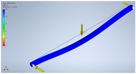 The simulation was performed with the technical characteristics provided by the software CES-EDUPACK and involving loads simulated in the CYPE CAD, and the beam of bamboo presented a great resistance and even superior to the profile that has been in use, as can be seen in Figure 11, and Figure 12 shows that the use of Guadua has a maximum displacement of 0.069 mm, which is very low and makes the material safe in every instance for these conditions, something that is represented in Figure 13 by the safety factor simulation. In this sense, the work of Archila-Santos et al. reported that in the year 1999, the coffee growing region of Colombia suffered a devastating earthquake of a magnitude of 6.2 in the Richter Scale, where most of the buildings made of Guadua survived the event with minor damage when compared with the structures made of concrete, of which almost 60% fell down [18].