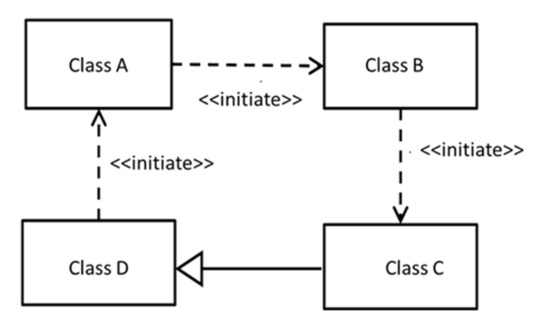 UML classes connect to each other with different relationships; one of them is the dependency relationship. The dependency relationships specify the object of class effects on the object of another class such as in initiate dependency when an object of a class is created, it also creates an object of another class. The dependency relationships are not only used in the class diagram they can also be used in package diagrams, component diagrams, and so forth. The dependency relationships which impact the correctness of the class model only those are considered in this work such as create/Initiate, drive, call and use. In the proposed solution, the dependency relationship is transformed into object property and some additional restrictions are also applied on them such as use and calls are annotated as transitive, and drive and create/initiate are annotated as transitive and asymmetric. Sometimes a class model can become incorrect due to some concealed aspects of the dependency such as a class model presented in Figure 3. According to the model, Class A initiates the object of Class B, when the Class B object is initiated, it initiates the object of Class C. Furthermore, Class C has a generalization relationship with Class D, and the Class C object will also be considered a Class D object due to inheritance. ultimately, there will be a cycle of objects initialization that will never end and the model will not be finitely satisfiable.