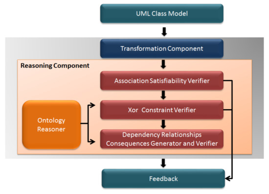 The proposed tool takes the UML class model in the XML Metadata Interchange (XMI) format, that is, XMI 2.41. The XMI provides the facility of exchanging UML models among the CASE tools in XML format. It provides a common format of UML models for sharing them among different CASE tools. The architecture of the prototype tool is shown in Figure 4. The UML class model in the XMI format is given as an input to the tool. The transformation component is responsible for transforming the UML class model into the ontology, so the proposed method can be implemented. The reasoning component is in charge of the verification of the UML class model. Finally, the feedback component generates feedback on the verification result.