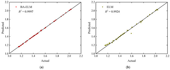 The predictive results of all models are illustrated in Figure 21a–f in the form of scatter plots and determination coefficients. It can be seen from the scatter plots that the BA-ELM provides less scattered estimates. Compared to other models, the fit line equation of BA-ELM is closer to the exact line (y = x), with a higher determination coefficient. It is followed by the ELM, BP, and Elman models. RBF and GRNN provide poor estimates while these two models also have lower determination coefficients of 0.9819 and 0.9883, respectively.