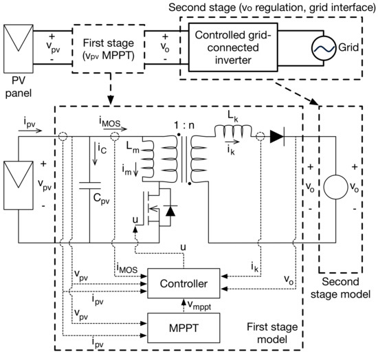 The first stage proposed in this paper is based on the flyback topology, which provides a high voltage conversion ratio without significantly increasing the duty cycle; thus, the controller will have a wide dynamic range for compensating perturbations, which is ideal for microinverter applications due to the large dc voltage required by the inverter. The flyback converter in Figure 1 is represented by both the magnetizing and leakage inductances and uses a transformer with a general turn-ratio n. The flyback converter has a MOSFET connected at the primary side of the transformer, driven by the binary control signal u, and a diode connected at the secondary side of the transformer. The connection between the PV panel and the flyback converter has an intermediate capacitor to regulate , and the output voltage of the first stage () is also the input voltage of the second stage. The circuit in Figure 1 represents the second stage of the microinverter using a voltage source, which exhibits a regulated average value due to the control action on the inverter, but it also exhibits sinusoidal perturbations at twice the grid frequency.