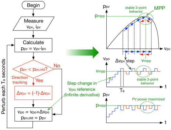 The perturb and observe algorithm is a hill-climbing optimization technique [2,26], which perturbs the independent variable and evaluates the changes on the optimized variable. In the PV system of Figure 1, the independent variable is the MPPT reference , while the optimized variable is the PV power , which are the input and output signals of the MPPT block, respectively.
