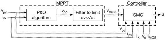 Since the reference exhibits step changes with infinite derivatives, an additional block must be inserted into the MPPT block to limit the reference derivative, which is needed to ensure that both reachability conditions (24) and (26) are fulfilled. The block diagram of Figure 3 shows the internal structure of the MPPT block, which includes a filter to limit the derivative of the reference provided by the P&O algorithm ( signal), thus providing a MPPT signal () with a derivative that ensures the global stability of the SMC.
