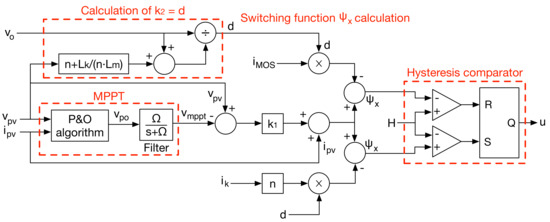 Such a control law is implemented using a hysteresis comparator, two adders, three subtractors, two multipliers, two gains, and a divider for the calculation of using (9). In addition, the MPPT filter can be implemented using an active filter based on the operational amplifiers. Figure 5 shows the block diagram for implementing the complete control system, including the MPPT block, the calculation of , the calculation of the switching function , and the hysteresis comparator that produces the MOSFET control signal u.