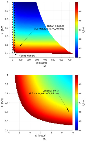 The left side of Figure 6a shows that low values of have an impact on both the settling time and values; hence, Figure 6b shows a zoom for 4 krad/s krad/s, which confirms the impact of on those qualities. In fact, such a figure shows that the same settling time is achievable with two couples of and values, where increments in allow the reduction in for the same value. For example, Figure 6b reports a second option for the SMC and filter parameters, named Option 2, which is characterized by krad/s and A/V, which ensures the same settling time of Option 1 ( ms). It is remarkable that reducing by 10.4 times only requires multiplying by 1.24 to obtain the same settling time with global stability. This condition is confirmed by the time responses depicted in Figure 7, where Figure 7a shows the time response of Option 1 (high ) and Figure 7b shows the time response of Option 2 (low ).