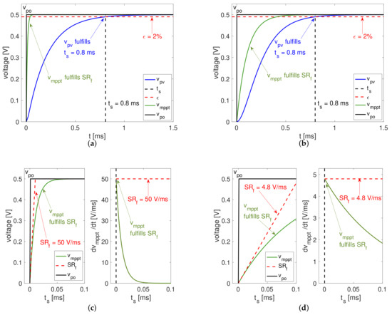 The time response of Option 1 (high ) shows that the PV voltage fulfills the desired ms. However, even though the derivative of fulfills the stability restriction, the high-value of imposes a fast rise in , and thus, a high voltage slew-rate ( V/ms) is needed. The time response of Option 2 (low ) shows that the PV voltage also ensures the desired ms, but the low value of imposes a slow rise in ; thus, a low voltage slew-rate ( V/ms) is needed, and a cheaper operational amplifier can be used to implement the reference filter in comparison to Option 1. Such a slew-rate difference is confirmed in Figure 7c,d, which shows the maximum slew-rate acceptable and the waveform of , and in both cases, is fulfilled, but Option 1 exhibits a much higher voltage derivative.