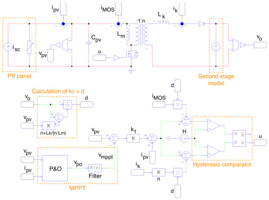 The validation of the flyback-based PV system and the designed SMC is performed using detailed circuital simulations implemented in the power electronics simulator PSIM [32]. The PSIM environment allows the implementation of the power circuit described in Figure 1 using accurate models for each element (MOSFET, diode, transformer, etc.), and the control circuit reported in Figure 5 was implemented using adders, gains, comparators, and other non-linear circuits. Finally, the P&O circuit was implemented using a C-block, which enables the introduction of a C-code, with the P&O algorithm, into the PSIM simulation, thus emulating the classical P&O implementation based on microcontrollers programmed with the same C-code. Figure 8 shows the PSIM implementation of both the power circuit and the control system.