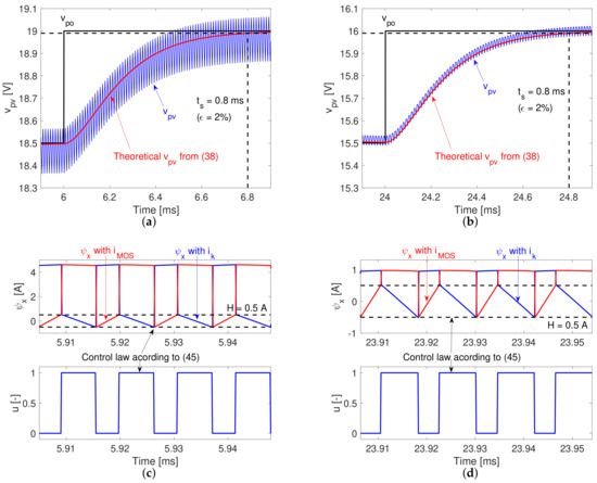 Figure 9 shows the results of the circuital simulations performed in PSIM, where the P&O algorithm provides step changes using the signal . Two different PSIM simulations were conducted, where the first one considers a high irradiance ( W/m) reaching the PV panel, and the second one considers a low irradiance ( W/m) condition; moreover, both conditions assume a PV module temperature of 25 °C (T = 25 °C). Thus, the PV system is tested under the extreme conditions considered in the design process. In this way, Figure 9a shows the PV voltage waveform, which has the same dynamic response as the theoretical signal generated with Equation (37) and previously tested in Figure 7. Therefore, the circuital response of the PV voltage has the desired settling time ms for high-irradiance conditions, as is observed in Figure 9a. Similarly, Figure 9b shows the PV voltage waveform for a low-irradiance condition, which describes the same dynamic response and settling-time, where the only difference is the smaller switching ripple, which is predicted by Equation (42), due to the lower PV current. In conclusion, the proposed SMC ensures the desired PV voltage response in any irradiance condition, which ensures the correct operation of the P&O algorithm.
