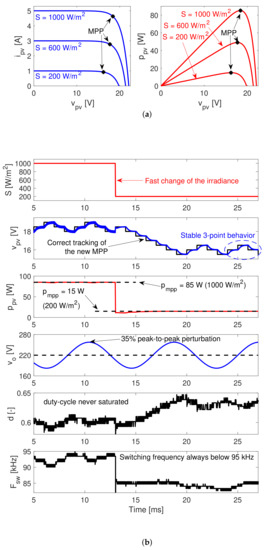 A correct operation of the PV system under the previous irradiance values must reach those MPP conditions. Therefore, the system was tested under variable irradiance conditions to confirm the correct operation of the SMC and P&O algorithm. In this way, Figure 10b shows the simulation of the PV system operating at 1000 W/m up to 13 ms, and at that time, the irradiance changes suddenly to 200 W/m. Moreover, this simulation also considers a 35 % peak-to-peak perturbation in the output voltage , which is caused by the inverter operation at the second stage of a PV microinverter. The simulation confirms the correct operation of both the P&O algorithm and SMC since the PV power is always at the MPP voltage for both irradiance conditions, except for the small time-interval between 13 ms and 18 ms, which is the time (5 ms) required by the P&O to track the new MPP condition. After the new MPP condition is reached, the PV voltage describes the stable three-point behavior of the P&O, which confirms the stable operation of the PV system.