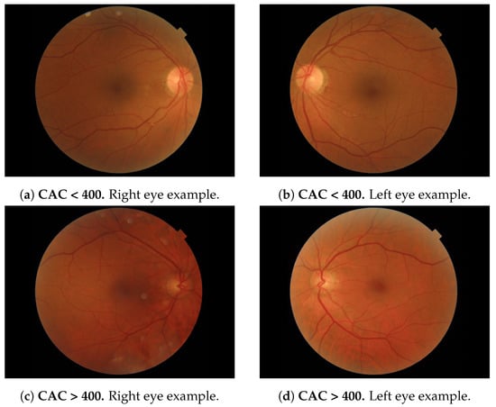 We used a RFI dataset from patients, i.e., 152 retinal images (left/right eye), 66 of them labelled as CAC > 400 (positive samples) and 86 labelled as CAC (negative samples). These images were selected from the PRECISED study (ClinicalTrial. gov NCT02248311). In this study, age between 46 to 76 years was an inclusion criteria. It should be noted that the incidence of cardiovascular events before 45 years is very low and, therefore, a screening strategy at younger ages are not cost-effective. Images have 3 channels (RGB). Image dimensions vary from , to (width, height and color channels). Figure 1 depicts 2 examples of each eye (one with CAC and one with CAC > 400) extracted from the database.
