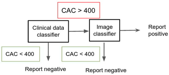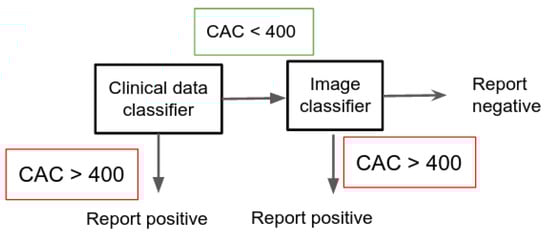 In this application, the ensemble is constructed by first running the model on the clinical data, and then for all the samples that resulted in a CAC classification run the image DL model. We only report CAC if in both cases the result was negative.