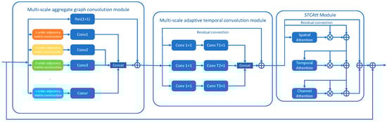 The data of the human skeleton is usually obtained from video by multimodal sensors or a pose estimation algorithm. The skeleton data is a series of frames containing the corresponding joint coordinates. The 2D or 3D coordinate sequences of the joints are fed into the network, and we construct a spatio-temporal graph. The joints are regarded as nodes in the graph, and the bones connected by adjacent joints are regarded as edges in the graph. We design a multi-scale adaptive GCN, which can model the long-range spatial dependence of the human body structure and extract richer spatial action features. Then we concatenate the multi-order feature maps obtained by the spatial graph convolution operation and then feed them into temporal module, whose purpose is to process temporal information and learn the joint movement information in the temporal sequences to add temporal features for the graph. Additionally, the MSATCN we proposed can extract three forms of different temporal range feature information and aggregate them to obtain high-level feature maps. Moreover, we apply the STCAtt to enhance the representation of features.