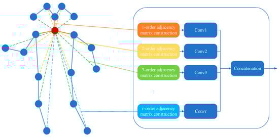 For better action recognition based on skeleton graphs, multi-scale spatial structural features need to be paid attention to, while traditional methods only consider the physical connections between joints, ignoring that there are also potential correlations between disconnected joints in the structure. For example, there are multi-hop connections between the left hand and the right hand, but it is very important to recognize the action of clapping. Therefore, we propose a multi-scale aggregate graph convolution module to explore the relevance of human skeleton data in the same frame. As shown in Figure 2, we build the multi-order adjacency matrices and adopt an adaptive method in each adjacency matrix to learn the topological structure of the graph to improve the flexibility of modeling semantic information, and finally we aggregate the obtained multi-order information to explore the spatial feature information of the skeleton sequence.
