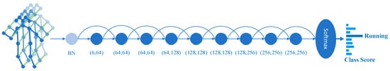 In the graph convolutional network, we construct a graph to represent human skeleton data, where is the set of nodes that symbolizes the joints of the human body; is the set of edges of the skeleton connected by adjacent joints; and represents the adjacency matrix of the edge, which encodes the connection of the edge, that is, if the node and are connected, then ; otherwise, . We define , where represents the identity matrix, and is the adjacency matrix with self-connection. Since cannot be multiplied directly, we first need to standardize it. According to [], the standardized Laplacian L can be formulated as , where the diagonal matrix , .