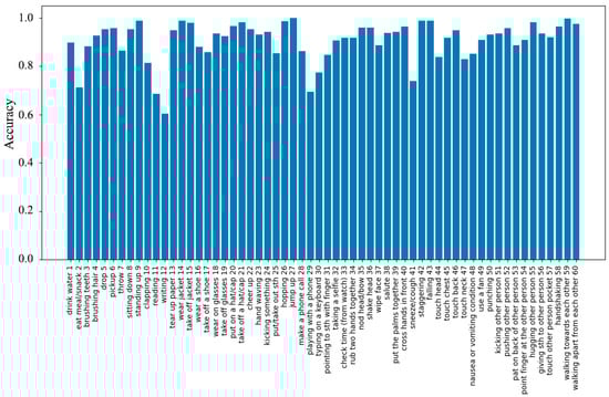 Kinetics: Kinetics [] is a large-scale video dataset for human action recognition, which contains about 300,000 video clips collected from YouTube; each clip is about 10 s. There are 400 action classes in the dataset, and there are at least 400 videos for each action. Since Kinetics only contains the original video clips, Yan et al. [] used the OpenPose toolbox to extract the skeleton data of the original data and estimated the position of each person’s 18 joints on each frame. The tool can generate 2D coordinates and confidence scores from the video clip, and we use to represent the joint. We selected the two people with the highest joint confidence if a clip contained multiple people. The dataset provides 240,000 clips as the training set and 20,000 clips as the validation set. We trained the model on the training set, and we used the Top-1 accuracy rate and Top-5 accuracy rate to evaluate the model on the validation set. Following the convention in [], we used two metrics: (1) Top-1 accuracy and (2) Top-5 accuracy to evaluate the validation set.