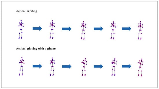 Visualization of the two actions of writing and playing with a phone. For each action, we selected five key frames to represent.