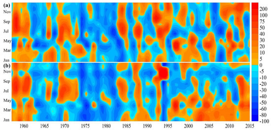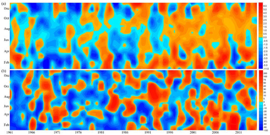 Variations in the observed monthly streamflow anomalies (%) during the period 1957–2015 at the (a) Kuwei and (b) Kelatashi national hydrological stations in the SAM.