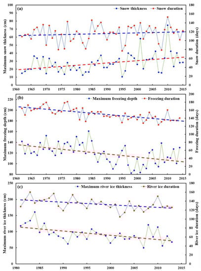 The cryospheric data included the observations of snow cover, SFG, river ice, and glaciers. The daily snow thickness and SFG depth during the cold season (October–April), snow cover and SFG durations, and soil temperature at 40-cm depth were monitored synchronously with the weather conditions by CMA. The timing of river ice formation and breakup was observed by HRB during the period 1981–2013, with the river ice thickness measured every 10 days. The glacier information was derived mainly from the First and Second Chinese Glacier Inventories, which were completed in the 1960s and 2000s, respectively.