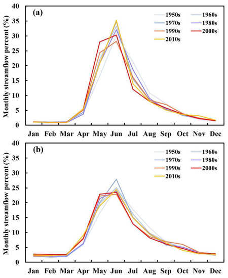 Snowmelt is the dominant factor in SAM hydrological processes. Hydrograph separation via stable isotope technology in the headwaters of the Irtysh River Basin highlighted that the contribution of snowmelt to runoff reached 58.1% during the spring snowmelt period, whereas rainfall, snowmelt, and groundwater accounted for 49.1%, 36.9%, and 14.0%, respectively, of the annual runoff [33]. Global warming has made these seasonal runoff distributions highly sensitive to changes in snowpack accumulation and melting in snowmelt-fed river basins [52], and this increased sensitivity is also observed in the SAM (Figure 5). Two typical SAM basins were analyzed to investigate the hydrological effect of cryospheric change: the Kuwei national hydrological station is located in the eastern part of the SAM where there are no glaciers [33,43], whereas the Kelatashi station is located in the western part of the SAM with this river being fed by both snow and glacial meltwater [47].