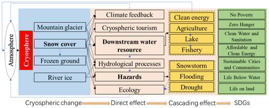 The cryosphere encompasses the portion of the Earth’s surface where water is in solid form, including mountain glaciers, ice cover, ice sheets, snow cover, permafrost, seasonally frozen ground (SFG), solid precipitation, and sea, lake, and river ice [1,2]. There are strong interactions between the cryosphere, Earth system, and anthroposphere [2,3,4]. The direct or cascading effects of the cryosphere on the human system consist of both positive and negative feedback. On the one hand, the cryosphere has triggered and exacerbated a series of natural disasters [5,6], such as avalanches [7] and snow drifts [8], permafrost collapse [9], rain-on-snow (ROS) flooding [10] and glacier lake outburst floods (GLOFs) [11,12], and drought [13]. On the other hand, the cryosphere serves the human being by supplying fresh water and regulating the climate and runoff [1]. Approximately 1.9 billion people are essentially fed (at least in part) by meltwater from the cryosphere [13,14,15,16]. For example, the water security of 800 million people in both the Indus and Tarim river basins is controlled by glacial meltwater in High Mountain Asia [13]. The cryosphere also provides a potential new perspective from which to view regional and global sustainable development, and will directly affect the realization of sustainable development goals (SDGs), including those related to eliminating poverty and hunger; the provision of clean water, sanitation, affordable and clean energy; and aquatic and terrestrial life [17].