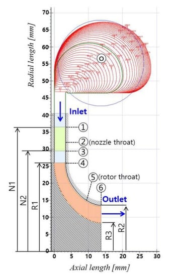 Figure 2 shows the meanline shape of the expander. The designed expander consists of a volute, nozzle, and rotor. Generally, a volute is symmetric. However, in this research, an overhang-shaped volute was selected to shorten the shaft length and increase the assembly. Cho et al. compared losses according to the shape of volute []. They conducted a CFD analysis of the loss in a circular volute and a rounded square volute. In this study, the volute shape was determined based on the fact that a circular volute has less loss than that of a rounded square volute. The major dimensions of the expander are shown in Table 4. The designed tip clearance between the rotor and shroud was 0.3 mm.
