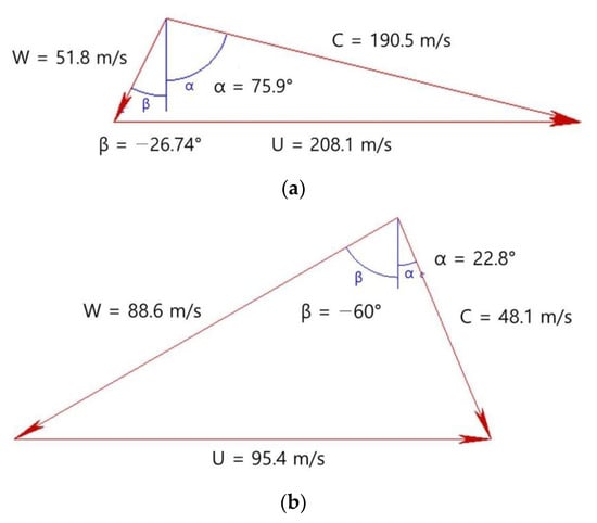 Velocity triangles at design points: (a) rotor inlet (incidence angle −26.74°) and (b) rotor outlet (deviation angle 22.8°).