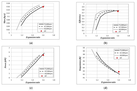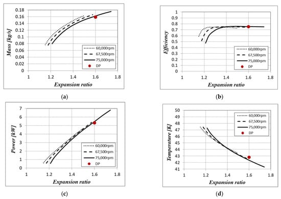 Performance prediction curves from meanline analysis: (a) expansion ratio vs. mass flow rate; (b) expansion ratio vs. efficiency; (c) expansion ratio vs. power; (d) expansion ratio vs. expander outlet temperature.