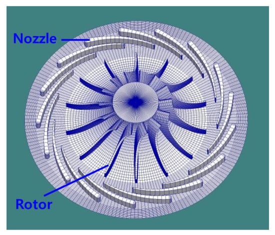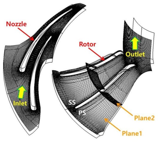 A mixing plane condition was applied between the nozzle outlet and the rotor inlet. Therefore, the average physical property value in the pitch direction was applied as the rotor inlet condition. In real operation conditions, the shape of the nozzle wake changes along with the rotor revolution, and to analyze it, unsteady calculations should be conducted. In this study, the focus was on efficiency improvement, and a steady calculation was conducted. The calculation was conducted for a single periodic passage.