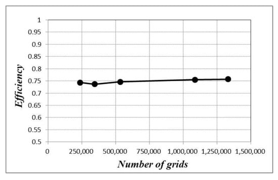 To determine the appropriate number of grids, the efficiency according to the number of grids was analyzed. Efficiency was compared for the following number of grids: 199,079, 239,403, 345,415, 534,415, 1,088,147, and 1,332,851. When the number of grids was greater than 239,403, there was no significant change in efficiency. In this study, the number of grid cells in the calculation domain was 1,088,147. Figure 6 shows the relationship of efficiency according to grid number to check grid independence. A hexa mesh was applied to generate a dense grid near the blade wall, and Y+ was set to 2.