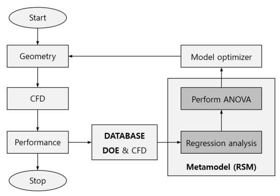 Optimization is an effective tool for selecting the best design among a variety of available options through identifying design variables and design objectives. Figure 8 shows a schematic of the design optimization process in this study. The initial design geometry was obtained via meanline design, and the performance of the design geometry was evaluated via CFD. The building of a database using design of experiments (DOE) and obtaining and optimizing a metamodel were performed using Minitab software. Metamodel optimization allows special insight into system performance and allows the system to be examined across a wide range of design conditions at a relatively modest computational cost [].
