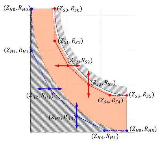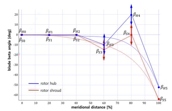 The hub and shroud meridional contours in the z–r plane and the blade angle distributions at the hub and shroud were chosen as the design parameters of the 3D radial expander rotor. The hub and shroud meridional contours and the control points of each Bezier curve are shown in Figure 9. The locations of the inlet and outlet points were fixed. To maximize the shape profiles with the minimum number of test cases, and , , , and were selected as the design parameters for the optimization of the meridional contours. Figure 10 shows the blade angle distributions at the hub and shroud and the control points of each Bezier curve. , , , and were selected as the design parameters for the optimization of the blade angle distributions.