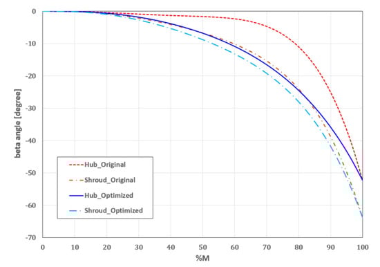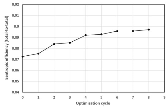 For the 4 design variables, 25 test cases were designed using the Box–Behnken design method using Minitab software. The design of 25 test cases alternated between the shape of the impeller meridional contours and the blade angle. In this study, the optimization process for the blade angle distributions was first conducted with the initially given geometry for the hub and shroud meridional contours. An optimal design for the blade angle distributions was achieved using the results of the 25 test cases. The next optimization process was performed for the hub and shroud meridional contours with the obtained geometry of the blade angle distributions from the first optimization process. The 25 CFD test cases presented an optimized geometry for the impeller meridional contours. As such, the optimization process alternated between optimization of the blade angle distributions and that of the impeller hub and shroud meridional contours. In this study, eight optimization cycles were executed. The metal models of optimizations are summarized in Table 5, and the enhancement of the isentropic total-to-total efficiency of the expander is presented in Figure 11. Figure 12 and Figure 13 show comparisons of the blade angle distributions and meridional contours obtained by optimization.