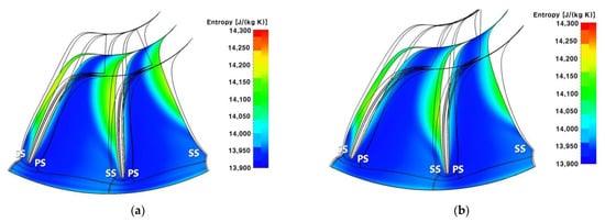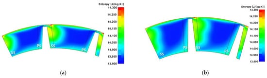 Comparison of entropy distribution at mid-span of the rotor (Plane 1): (a) original model and (b) optimized model.