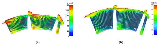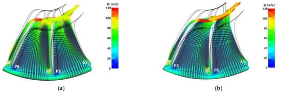 As shown in Figure 18, in the case of the original model, a strong tip leakage flow occurs from the pressure blade side to the suction blade side. In the original model, a stronger tip leakage flow occurred in the relatively narrow passage area than in the optimized model, resulting in increased losses and consequently affecting efficiency.