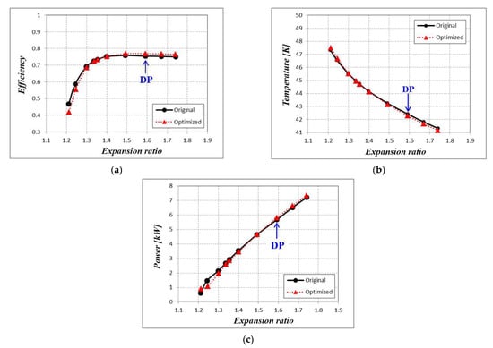 Performance comparisons between the original model and optimized model: (a) expansion ratio vs. efficiency; (b) expansion ratio vs. expander outlet temperature; (c) expansion ratio vs. expander power.